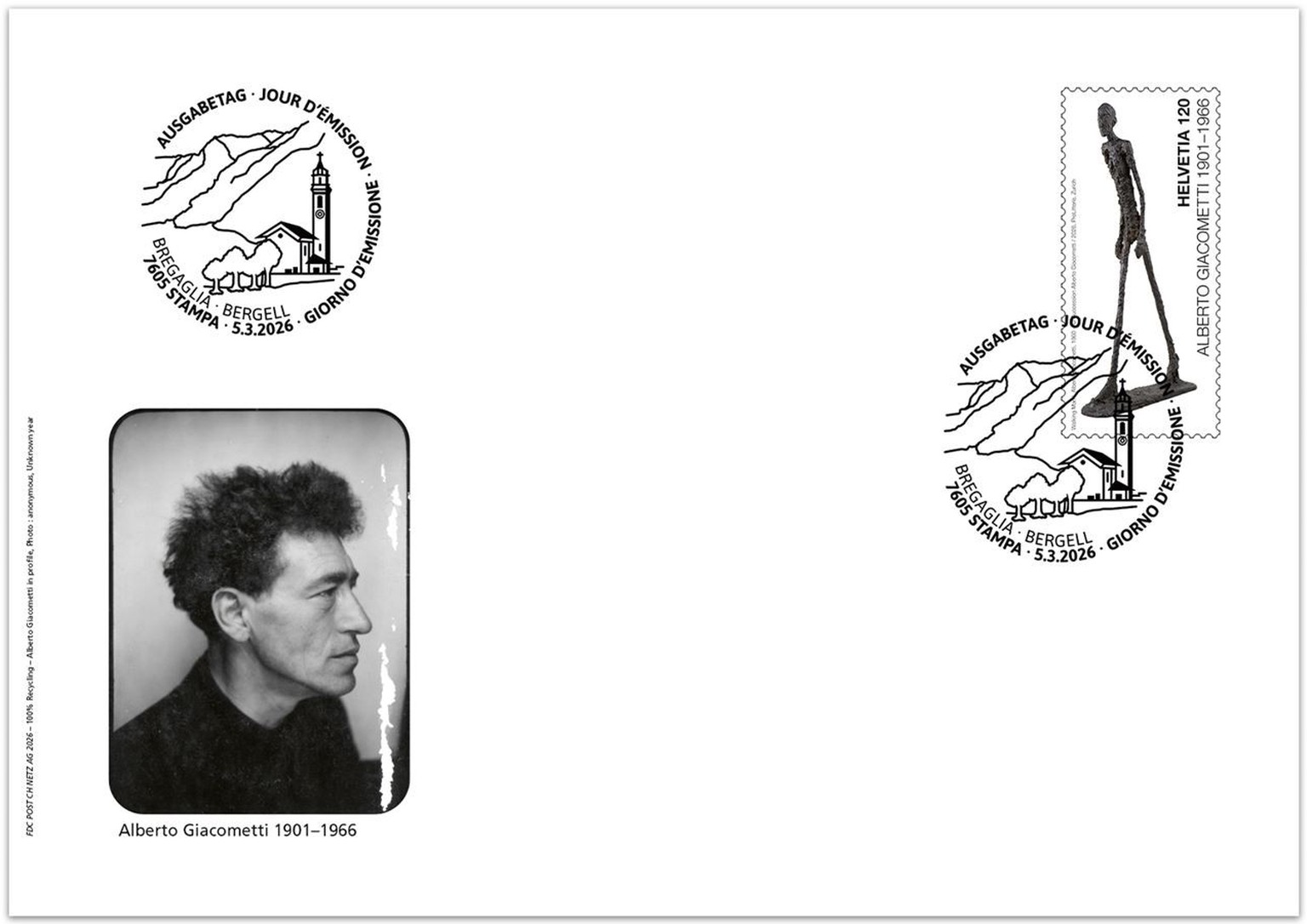 En 2026, la Suisse célèbrera l'artiste Alberto Giacometti (1901–1966) à l’occasion du 125e anniversaire de sa naissance et du 60e anniversaire de sa mort. La Poste Suisse émettra le 5 mars un timbre spécial, inspiré de son œuvre emblématique «L’Homme qui marche I» (1960), une sculpture marquante du XXe siècle qui a notamment orné nos billets de 100 francs de 1995 à 2014.