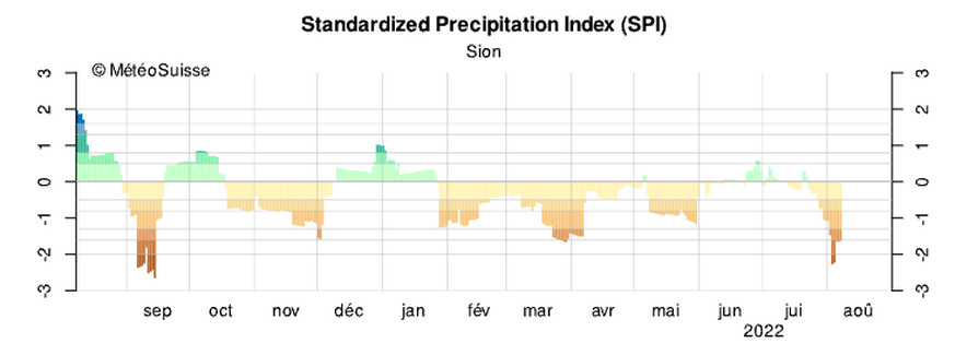 Le graphique ci-dessous, relatif à la station de mesure de Genève/Cointrin, le montre clairement. Depuis fin janvier, le SPI est constamment en dessous de zéro, avec des pics de -3 en juin, juillet et août. Dimanche 7 août, le SPI se montait à -1,8, ce qui équivaut à la catégorie «très fortement sec».