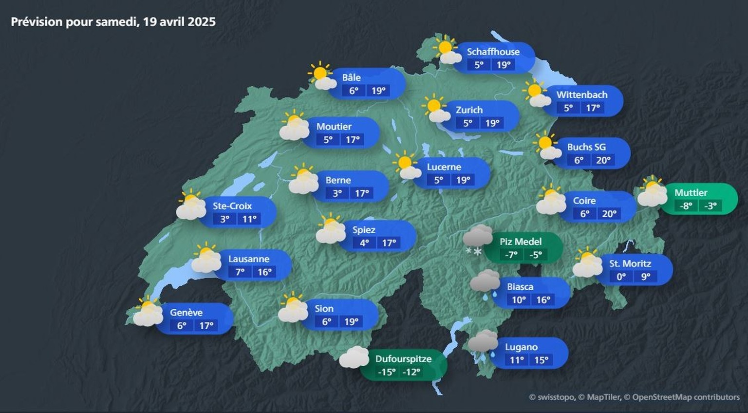 Du côté de Météo Suisse, Daniel Murer résume la situation ainsi: le Vendredi saint, le nord du Jura et l'est du Plateau demeureront passablement dans la grisaille. De nombreux autres endroits du pays devraient profiter du soleil. Pour samedi, le soleil devrait à nouveau briller un peu partout en Suisse, sauf au Tessin, à cause des nuages de poussière.