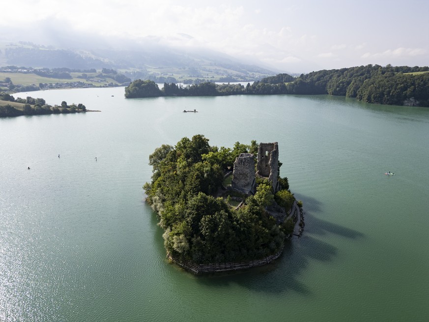 ARCHIV - L'ile d'ogoz et le lac de Gruyere sont photographies avec un drone, ce dimanche 17 aout 2025, a Le Bry (FR). (KEYSTONE/Anthony Anex)