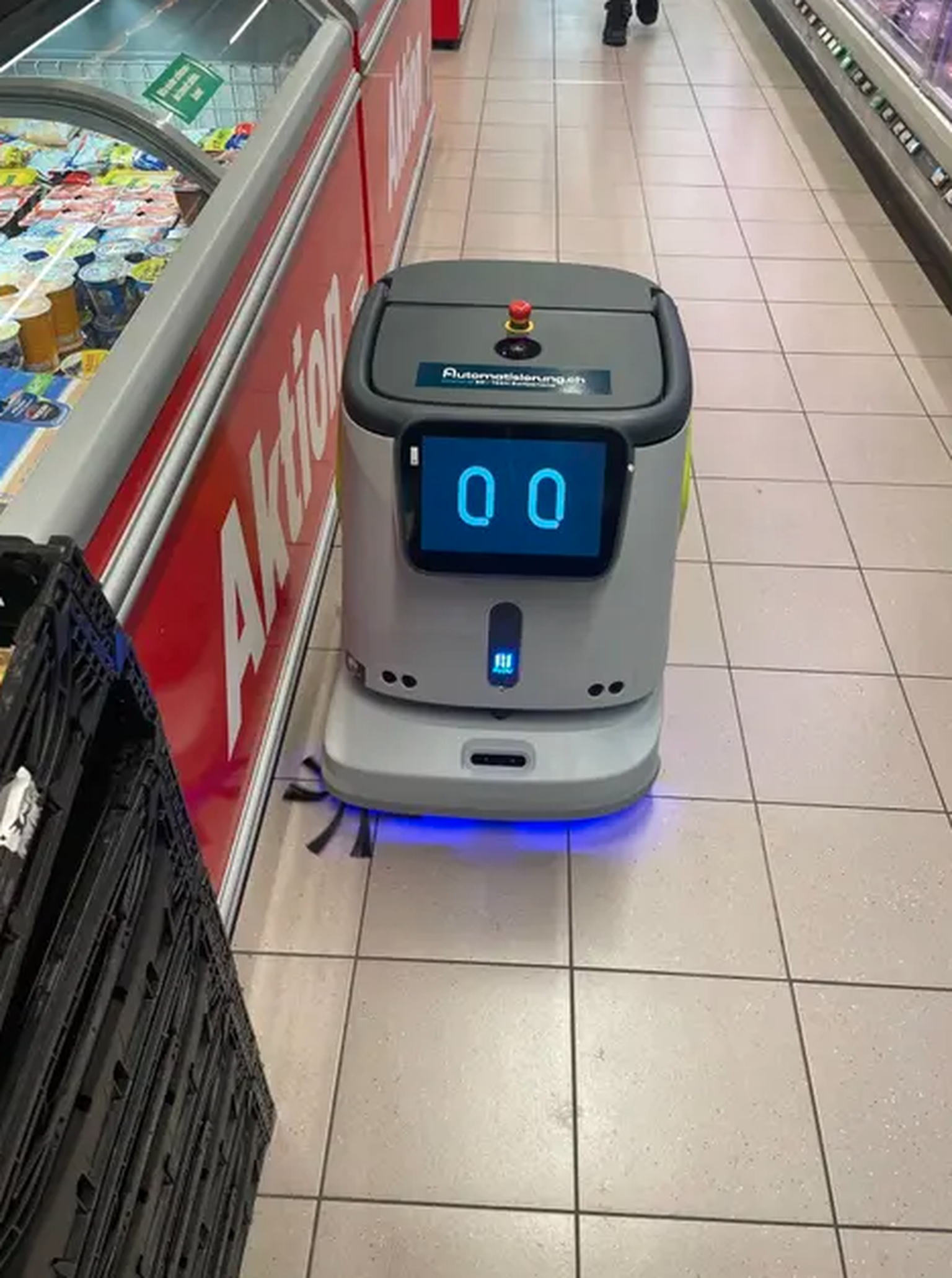 Nous sommes vendredi soir, une heure avant la fermeture de la succursale Denner d'Opfikon dans la banlieue zurichoise. Les clients se tiennent devant les rayons et s'emparent de sandwichs, de salami et de chocolat. Mais ils ne sont pas seuls: dans les allées du magasin, un robot est en train de tourner autour des clients et de frotter le sol.