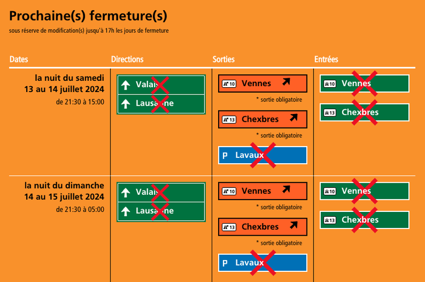 L’autoroute A9 sera totalement fermée à la circulation entre les jonctions de Lausanne-Vennes et Chexbres (VD) de samedi à 21h30 heures, le 13 juillet, au lundi à 4 heures du matin, le 15 juillet, en raison d'une opération «coup de poing» à Pully. Elle sera partiellement réouverte à la circulation en bidirectionnel sur la chaussée montagne, direction Valais, dimanche de 14h00 et à 22h00.