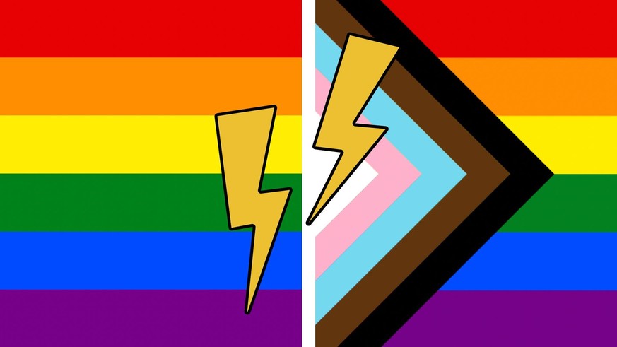 Ce distinguo, et parfois ce fossé, se retrouve et s’incarne principalement dans deux drapeaux: d’un côté, l’historique «rainbow flag», aux couleurs de l’arc-en-ciel, conçu en 1978; de l’autre, l’inclusif ou «Progress Pride», qu’on pourrait traduire par «fierté et progressisme», apparu récemment, en 2018.