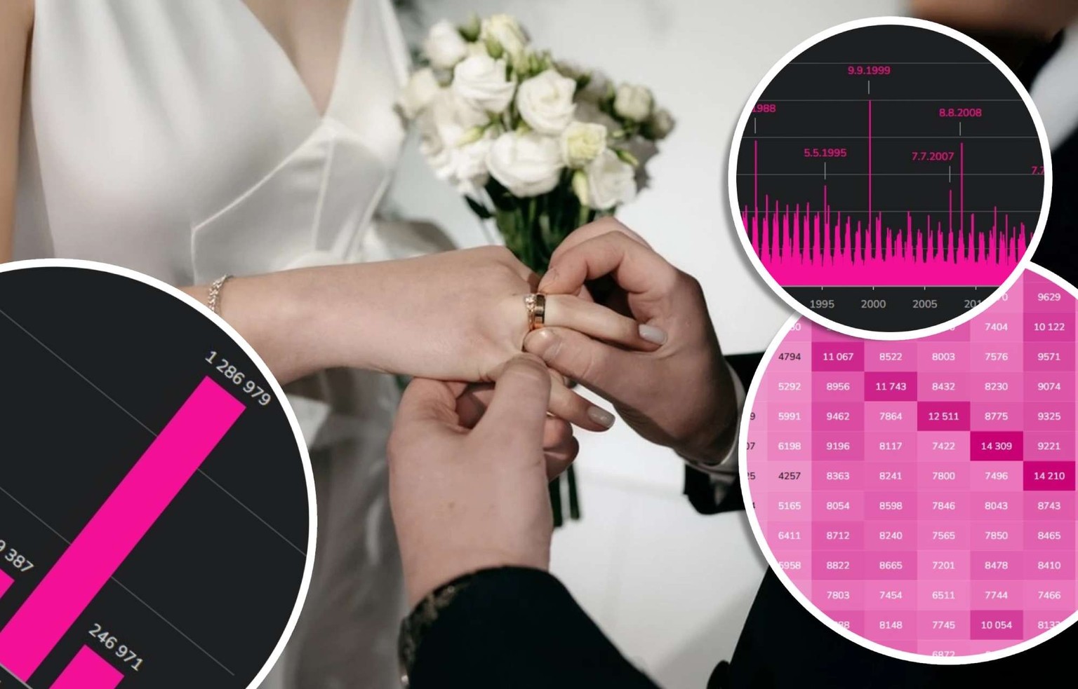 Le deuxième jour le plus populaire a été le 8.8.1988, avec 1 954 mariages. Le fait qu'un autre 8 août, le 8.8.2008, se trouve sur le podium n'est pas un hasard. Après tout, le 8 est considéré comme un chiffre porte-bonheur dans de nombreuses cultures. Ce qui est étrange, c'est que, dans les années 70, les dates répétées ne semblaient pas encore avoir la cote. Les données du 7 juillet 1977 ne montrent en tout cas pas d'augmentation notable, et seuls 496 couples ont officialisé leur union ce jour-là.