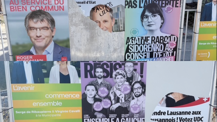 Une vitre de voiture s'abaisse: «Ce n'est pas une ville d'UDC», nous lance un automobiliste, nous surprenant à photographier les affiches au carrefour de l'avenue Tivoli et de l'avenue du Belvédère. Les trois candidats pour succéder à Rebecca Ruiz au Conseil d'Etat (Roger Nordmann, Jean-François Thuillard et Agathe Raboud Sidorenko) y côtoient les candidats aux prochaines élections municipales. Ces affiches jalonnent de nombreux quartiers lausannois, du pont Bessières au pont Chauderon, en passant par l'avenue de Béthusy.