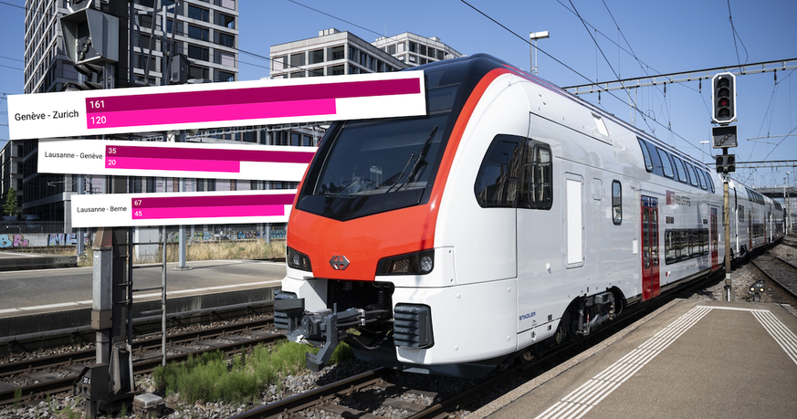 Un trajet direct et rapide entre les deux grandes villes? En portant certaines lignes à une vitesse maximale de 300 km/h, d'importantes réductions de temps de trajet seraient envisageables. Il serait possible de se rendre de Zurich à Genève en 1 heure et 20 minutes, contre 2 heures et 41 minutes actuellement..
