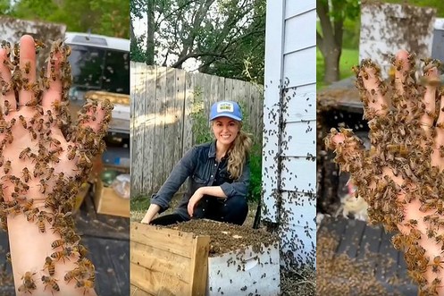 Cette femme couvre ses mains d'abeilles, dans le plus grand des calmes