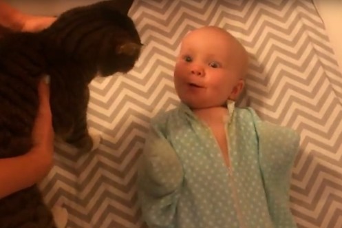 C'est le coup de foudre! Ce bout de chou est tellement content de voir son chat – c'est adorable