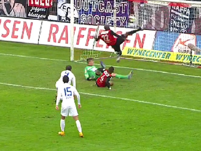 Mit einem spektakulären Fallrückzieher auf der Torlinie rettet dieser Goalie sein Team vor dem sicheren Rückstand