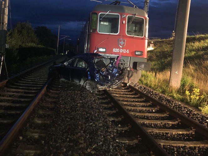 Lieferwagen landet nach Crash mit Auto im Silsersee