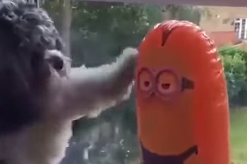 Hund provoziert Minion. Dieser schlägt jedoch brutal zurück