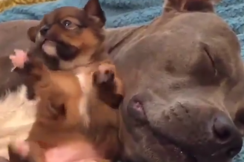 Dieser Pitbull darf das neue Kätzchen begutachten