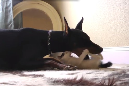 Dieses freche, um sich schlagende Kätzchen testet die Geduld zweier Dalmatiner