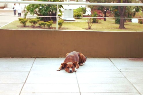 Weil dieses Hündchen nicht alleine fressen mag, schleppt es seinen Napf rückwärts durch den Speisesaal