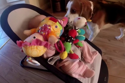 Erst klaut der Hund dem Baby das Spielzeug, dann macht er seinen Fehler wieder gut