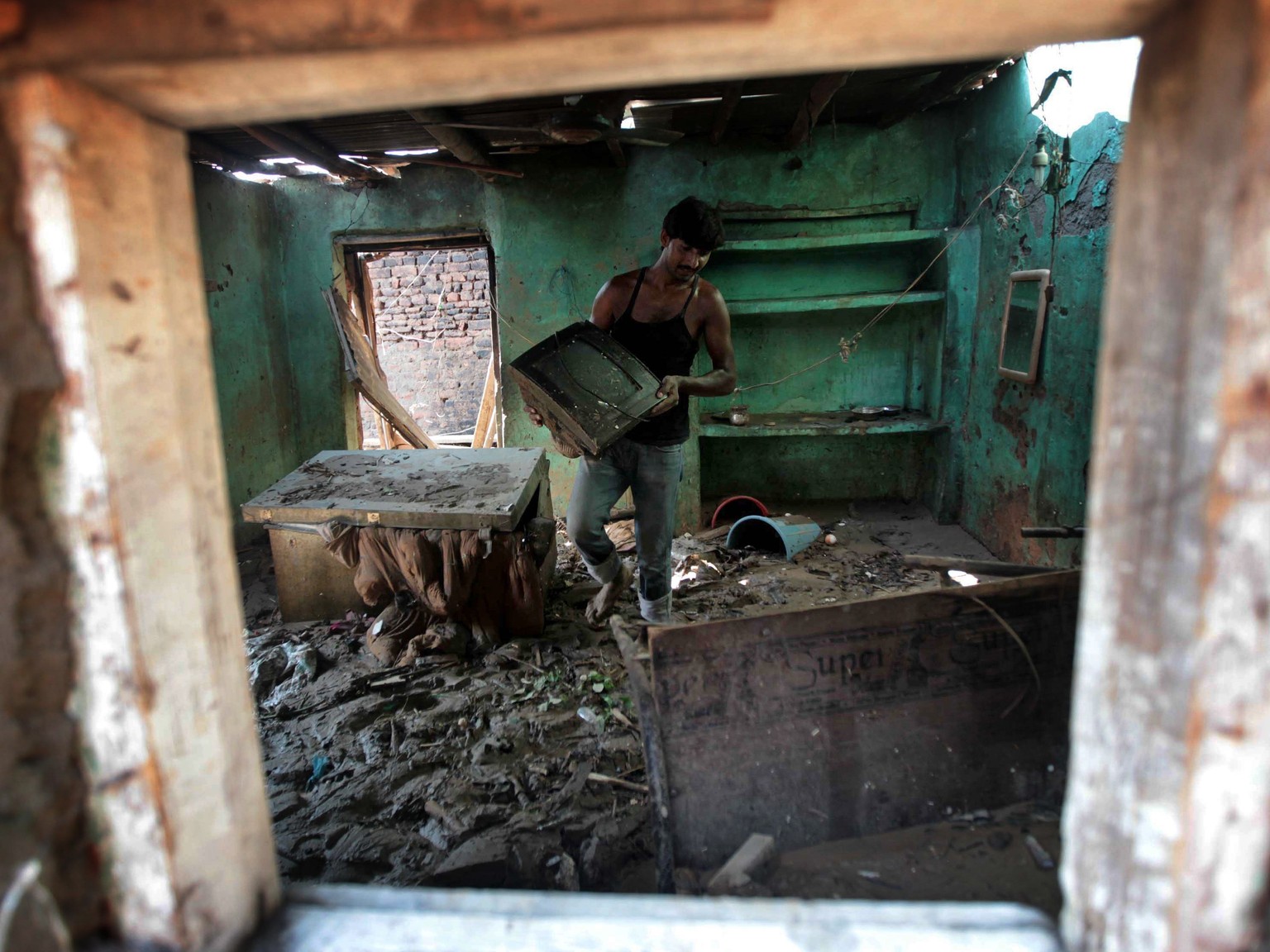 Ein Dorfbewohner rettet in Poonch, einem Dorf nahe Srinagar, Hab und Gut aus den Trümmern seines Hauses.Bild: AFP