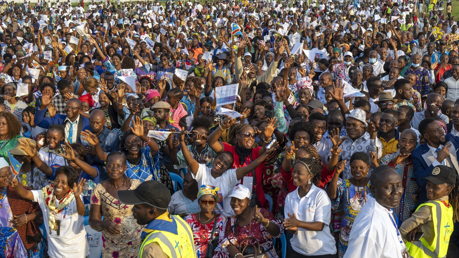 Schon im Morgengrauen ziehen die Gläubigen zum alten Militärflughafen von Kinshasa, um den Papst zu sehen. Frauen, Männer und Kinder aus der Demokratischen Republik Kongo (DRK) feiern bereits lange vor Beginn der Messe, singen, tanzen und schwenken Fähnchen. In der DRK ist mehr als die Hälfte der 100 Millionen Einwohnern katholisch.