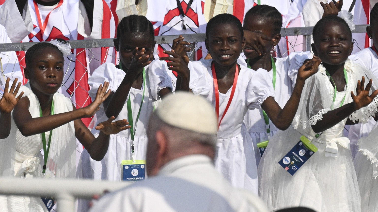 Viele Gläubige trugen bunte Kleider oder Hemden aus Stoffen mit dem Konterfei von Franziskus. «Bandeko, boboto», sagt der Pontifex zu Beginn seiner Predigt in Kongos Landessprache Lingala, und mehr als eine Million Menschen jubeln dem Gast aus dem Vatikan zu. Franziskus lächelt und wirkt glücklich.