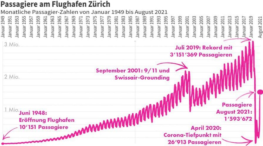 Auch wenn in den letzten beiden Monaten die Zunahme des Flugverkehrs von rund 600'000 im Juni auf 1,6 Millionen im August massiv war, so wird es nicht im gleichen Stil weitergehen. Schon vor der Coronapandemie waren die Monate Juli und August jene mit den höchsten Zahlen.