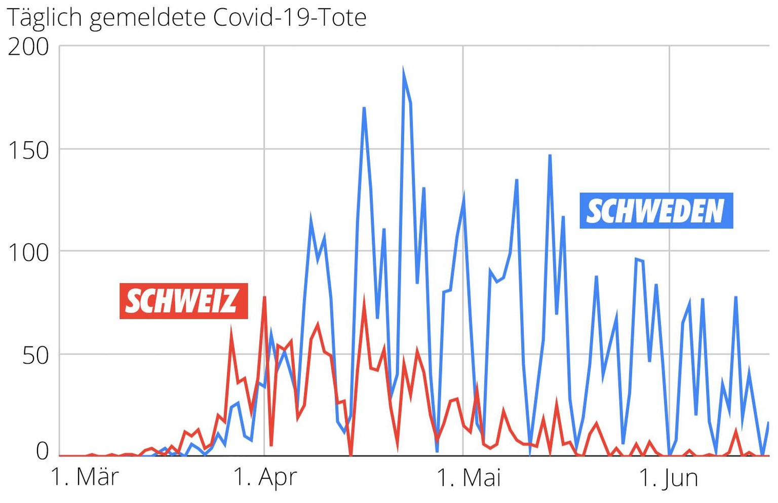 Zuerst aber zu den Todesopfern: Schweden hat durch Covid-19 sehr viele Menschenleben zu beklagen. Am Dienstag wurden total 4891 Tote gemeldet. Das entspricht rund 47 Toten pro 100'000 Einwohnern, deutlich mehr als alle anderen skandinavischen Länder und auch deutlich mehr als die Schweiz (knapp 20 Tote pro 100'000 Einwohner).