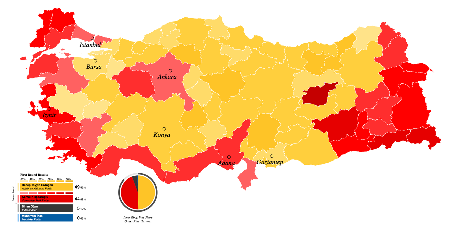 Laut dem offiziellen Wahlresultat ist Erdogan knapp an der für den Wahlsieg nötigen 50 Prozent vorbeigeschrammt. Er kam demnach auf 49,52 Prozent. Herausforderer Kilicdaroglu schaffte fast 45 Prozent, der Kandidat der ATA-Allianz Sinan Ogan knapp 5 Prozent. Muharrem Ince, der seine Kandidatur kurz vor der Wahl zurückzog und damit offiziell aus dem Rennen ausschied, schaffte trotzdem 0,43 Prozent der Stimmen.
