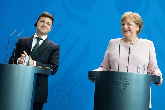 Es ist der Eisbrecher bei der ersten Begegnung von Merkel und Selenskyj, für das es keine guten Vorzeichen gab. Der frühere Komiker hat Mitte Mai Petro Poroschenko als Staatsoberhaupt abgelöst. Im ukrainischen Wahlkampf war Merkel Parteinahme für Poroschenko vorgeworfen worden, weil sie ihn eine Woche vor der Stichwahl in Berlin empfangen hatte, Selenskyj aber nicht. Aber auch dieses Problem räumt Selenskyj aus: «Das ist ja ihre Angelegenheit, ich verstehe das so, dass das normal ist. Aber auf höchster Ebene trifft sich Frau Bundeskanzlerin heute mit dem Präsidenten der Ukraine.»