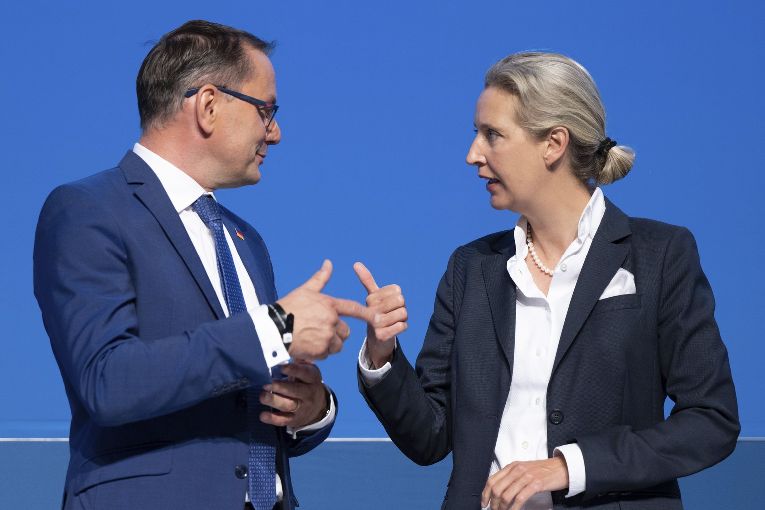 Gemeinsam führen Chrupalla und Weidel nun sowohl die Bundestagsfraktion als auch die Bundespartei an. Vielleicht auch um zu zeigen, dass sie reibungslos zusammenarbeiten können, hatten sie sich gegenseitig als Kandidaten für den Chefposten vorgeschlagen. Das Erfolgsmodell in der Fraktion werde man «auf die Partei spiegeln», sagte Weidel. Sie kritisierte die Arbeit des letzten Bundesvorstands, dem sie als Stellvertreterin angehört hatte: «Schlechter konnte man das alles gar nicht mehr machen.»