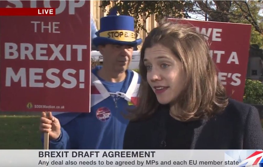Am Mittwochvormittag befragt eine Journalistin des Fernsehsenders die Europaexpertin Georgina Wright von der Denkfabrik Chatham House zu den neusten Entwicklungen. Wie viele andere TV-Beiträge zur britischen Politik wird das Live-Interview vor dem Westminster Palace gedreht – dem Sitz des britischen Parlaments. Dort hat sich eine kleine Gruppe EU-freundlicher Demonstranten eingefunden. Wie jeden Tag demonstrieren die Aktivisten des «Stand of Defiance Euorpean Movement» für einen Verbleib Grossbritanniens in der EU.