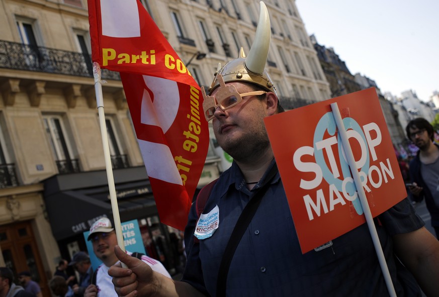 Die Demonstranten zogen am Samstagnachmittag durch das Zentrum der französischen Hauptstadt und hielten dabei Schilder mit Aufschriften wie «Stop Macron» in die Höhe. Unter den Teilnehmern der Demonstration waren Studenten und Vertreter der seit Wochen immer wieder streikenden Eisenbahner. Macrons Wahl an die Staatsspitze jährt sich am Montag zum ersten Mal.