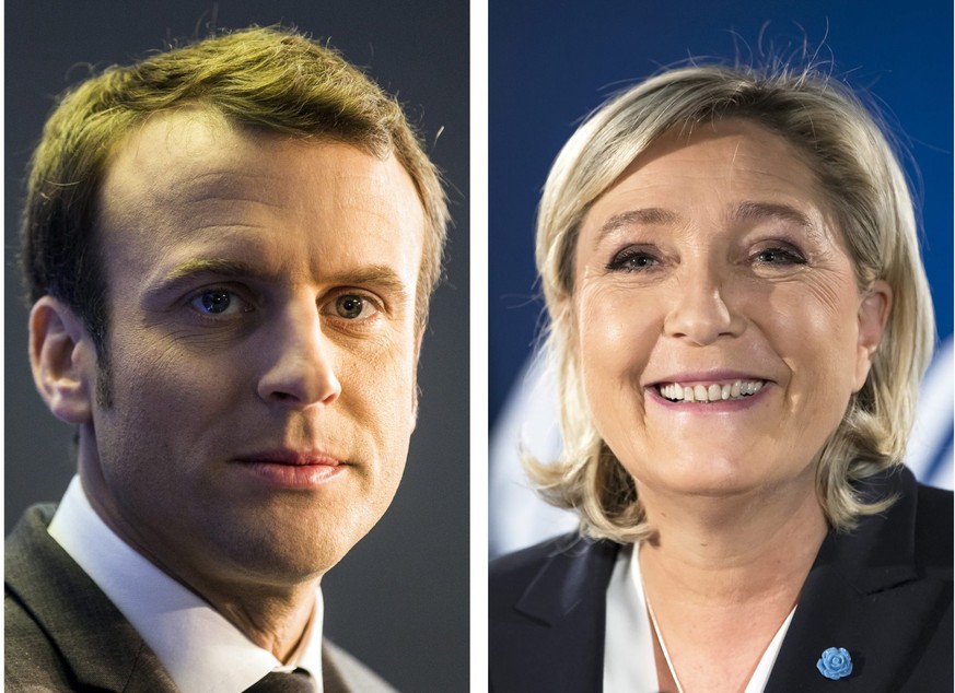 Der parteiunabhängige Kandidat bei der französischen Präsidentenwahl, Emmanuel Macron, und die Rechtsextreme Marine Le Pen liegen laut Umfrage in der ersten Wahlrunde fast gleichauf. Le Pen liegt demnach bei 26 Prozent, Macron bei 25.5 Prozent.
