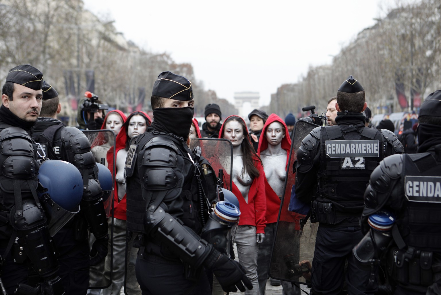 Auf den Champs-Élysées demonstrierten mehrere Frauen halb nackt als Marianne verkleidet und standen minutenlang stumm den Sicherheitskräften gegenüber. Marianne ist die Nationalfigur der französischen Republik. Auf Bildern wird sie gewöhnlich mit einer phrygischen Mütze bedeckt und mit nackten Brüsten gezeigt.