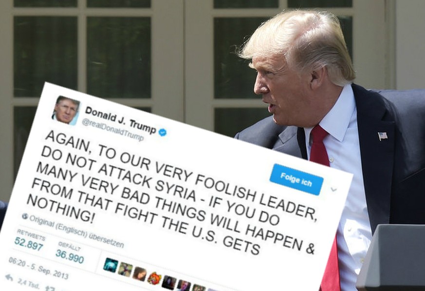 «Wir sollten uns verdammt nochmal aus Syrien raushalten. Die ‹Rebellen› sind genauso schlimm wie das aktuelle Regime. Was werden wir für unsere Leben und Milliarden von Dollar bekommen? Nichts.» Dies twitterte Trump 2013 als Obama den damaligen Chemiewaffen-Einsatz durch Assad bestätigte.