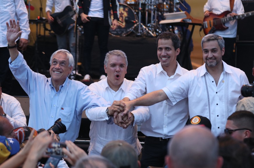 Trotz eines Ausreiseverbots hat der selbsternannte venezolanische Übergangspräsident Juan Guaidó ein Benefizkonzert seiner Anhänger im kolumbianischen Grenzort Cúcuta besucht. In der Nähe der Bühne traf er auf den kolumbianischen Staatschef Iván Duque.