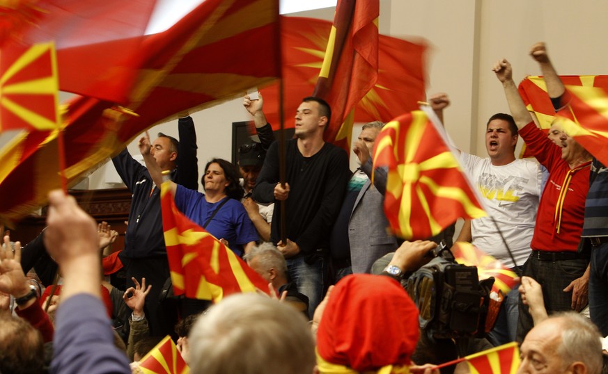 Rund 100, teils maskierte Demonstranten drangen am Donnerstagabend in das Parlamentsgebäude ein, schwenkten mazedonische Flaggen und sangen die Nationalhymne. Videobilder zeigten umgeworfene Stühle und Kamera-Stative. Reporter sahen Oppositionsführer Zoran Zaev mit blutverschmiertem Gesicht in einer aufgebrachten Menschenmenge.