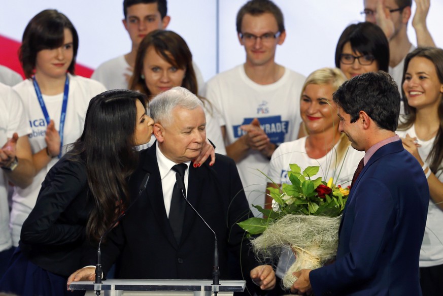 Küsschen von der Tochter: Jaroslaw Kaczynski, Mitgründer der siegreichen Partei «Recht und Gerechtigkeit».