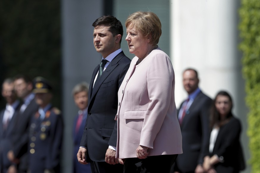 Am Dienstag treten Merkel und Selenskyj gut eine Stunde nach den militärischen Ehren und einem Arbeitsmittagessen vor die Kameras. Es geht um die Krise auf der Krim und im Donbass, die Aggression von Russlands Präsident Wladimir Putin gegen die Ukraine, die Sanktionen gegen Moskau und die umstrittene Gaspipeline Nordstream 2. Und natürlich um die Szene zu Beginn des Besuchs.