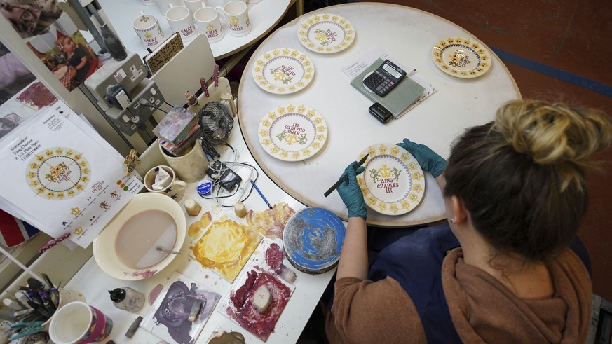 Wenige Monate vor der Krönung von Charles III. beginnt der Verkauf von Souvenirartikeln. Das britische Töpferunternehmen Emma Bridgewater rechnet mit hoher Nachfrage nach Tassen, Tellern und Teekannen. Das Motiv – eine Krone samt Löwe und Einhorn als Zeichen der britischen Monarchie – wird mit einem Schwammstempel aufgetragen und dann per Hand verziert. Charles und seine Königsgemahlin Camilla werden am 6. Mai in der Londoner Westminster Abbey gekrönt.