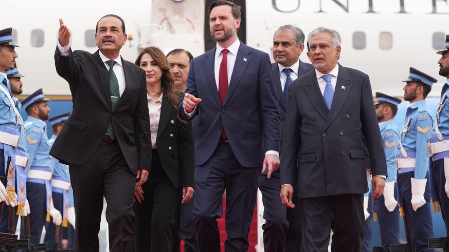 (vlnr.) Pakistans Armeechef, Feldmarschall Asim Munir, US-Vizepräsident JD Vance und der Pakistanische Aussenminister Mohammad Ishaq Dar bei den Verhandlungen zwischen Iran und den USA.Bild: keystone