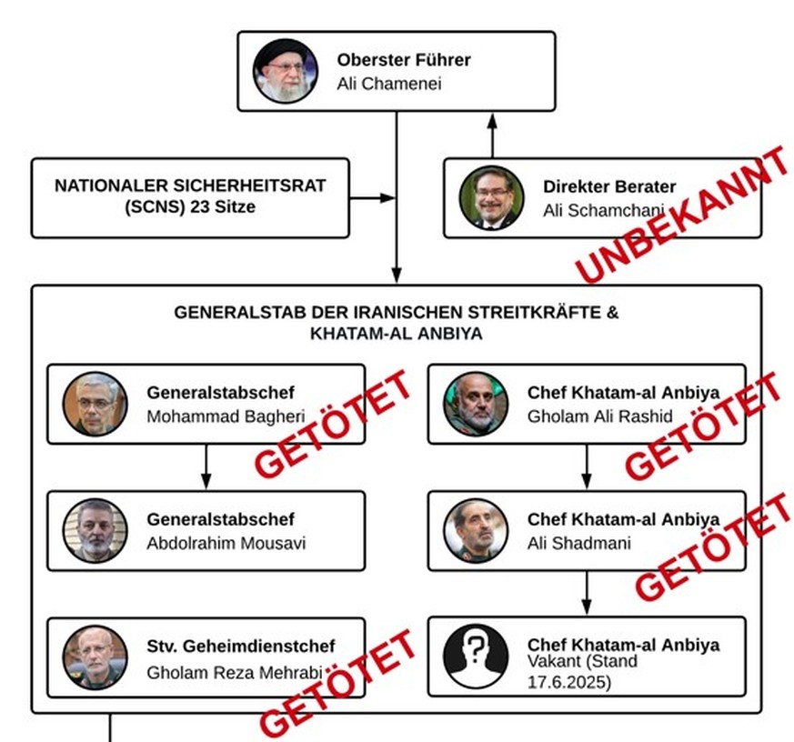 Sicher sind hingegen die Tötungen von diversen Mitgliedern des Generalstabs beider iranischen Streitkräfte. Mit Schadmani traf es innerhalb weniger Tage den zweiten Chef der Kommandozentrale Chatam-al-Anbija.