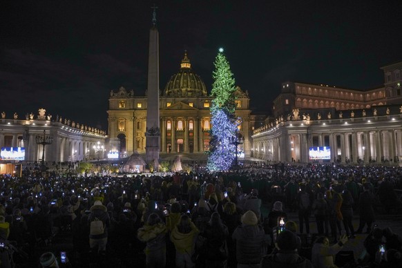 Auch im Vatikan kommt jetzt festliche Stimmung auf: Mit dem Einbruch der Dunkelheit erstrahlte am Samstagabend erstmals der traditionelle riesige Weihnachtsbaum auf dem Petersplatz in Rom prachtvoll geschmückt und in vollem Glanz. Es ist alte Tradition, dass der Baum gestiftet wird. Die 29 Meter hohe Rotfichte kommt in diesem Jahr aus dem Trentino in Norditalien.