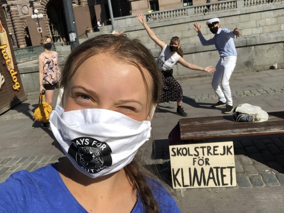 Ausgestattet mit ihrem Schild mit der Aufschrift «Skolstrejk för klimatet» (Schulstreik fürs Klima) und Mund-Nasen-Schutz mit dem Logo von Fridays for Future traf sich die Klima- und Umweltaktivistin am Freitag mit einer Handvoll Mitstreitern vor dem Reichstag in der schwedischen Hauptstadt. Das zeigten Bilder, die die 18 Jahre alte Schülerin am Morgen auf Twitter und Instagram teilte.