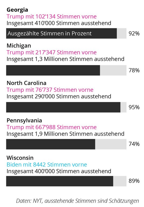 Zu den wichtigen «Swing States» zählen unter anderem Florida, wo 29 Wahlleute an den Gewinner vergeben werden, Pennsylvania (20), Ohio (18) und North Carolina (15). Umfragen deuteten aber auch ein Kopf-an-Kopf-Rennen in Texas an. Der bevölkerungsreiche südliche Bundesstaat mit 38 Wahlleuten geht seit Jahrzehnten an Republikaner. In Umfragen lag Trump nur sehr knapp vor Biden. In diesen Staaten schliessen die Wahllokale später.