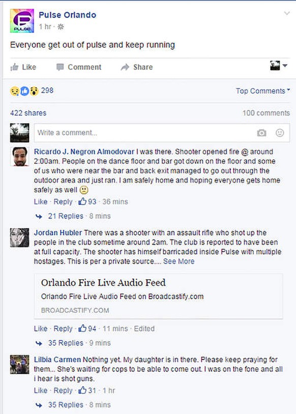 «Zuerst dachte ich, die Schüsse wären Teil der Musik», sagt Club-Besucher Kenneth Melendez der Lokalzeitung «Orlando Sentinel». «Ich fing an zu rennen und sah einen, der am Arm blutete, und dachte, Wow, das passiert wirklich.» Vier seiner Freunde seien verletzt worden. Das «Pulse» sei immer eine so «sichere Umgebung» gewesen, «in der man sich ausleben konnte». (Spiegel Online)