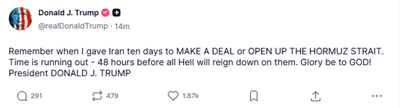 US-Präsident Donald Trump droht dem Iran mit schweren Angriffen, sollte die Führung in Teheran sich nicht seinem Ultimatum zur Öffnung der Strasse von Hormus beugen. «Die Zeit läuft davon – 48 Stunden, bevor die Hölle über sie hereinbricht», schrieb er auf seiner Plattform Truth Social. Die Bedingungen seien erfüllt, wenn der Iran einem Abkommen zustimme oder die Strasse von Hormus öffne.