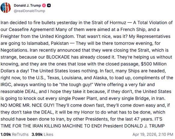 Im Konflikt mit dem Iran reist nach Angaben von US-Präsident Donald Trump wieder eine Delegation aus Washington für Verhandlungen in die pakistanische Hauptstadt Islamabad. Seine Vertreter würden dort am Montagabend sein, schrieb Trump auf der Plattform Truth Social ohne Angaben zur Zeitzone zu machen. (sda/dpa)