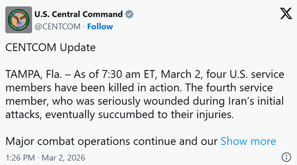 Das US‑Zentralkommando (US Central Command) erklärte, dass drei seiner F‑15‑Jets, die im Rahmen der Militäraktion «Operation Epic Fury» – der US‑Operation gegen den Iran – eingesetzt waren, über Kuwait abgestürzt seien, nachdem sie offenbar durch einen versehentlichen Eigenbeschuss getroffen worden waren.