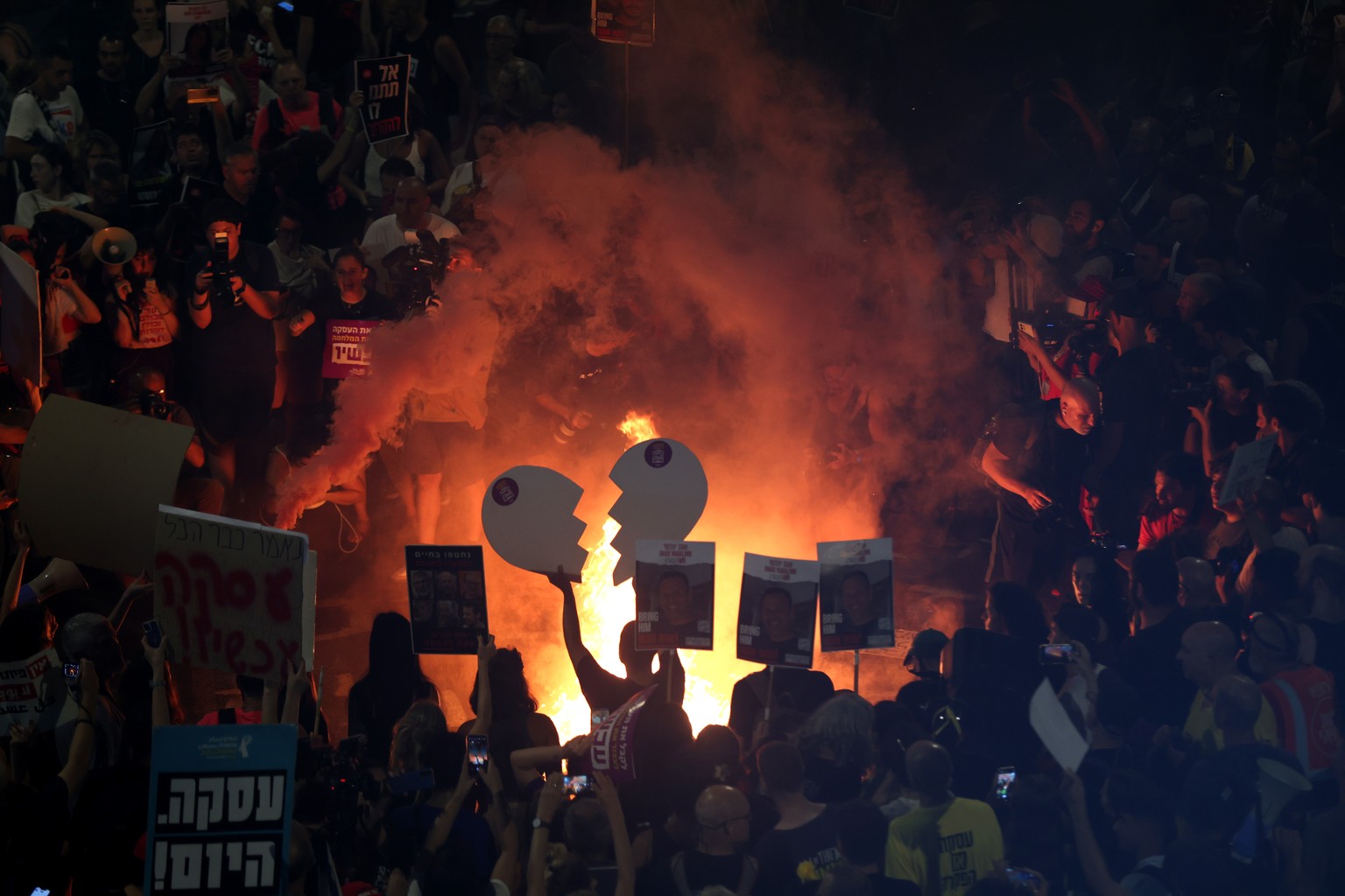 epaselect epa11587702 Protesters light a fre during a march calling for a ceasefire and for the release of Israeli hostages held by Hamas in Gaza, near the Kirya in Tel Aviv, Israel, 05 September 2024 ...