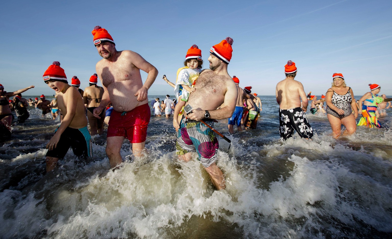 Zum traditionellen Neujahrsschwimmen in den Niederlanden sind am Freitag tausende Menschen in die Nordsee gesprungen. Bei strahlendem Sonnenschein und vergleichsweise milden Temperaturen nahmen allein in Den Haag 10'000 Menschen ein Bad im Meer.