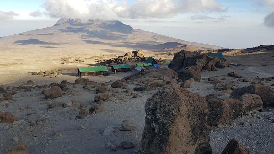 Die Gruppe erreicht am dritten Tag die Kibo-Hütte auf 4750 Metern über Meer. Im Hintergrund steht der in Wolken gehüllte Mount Mawenzi (5148MüM).