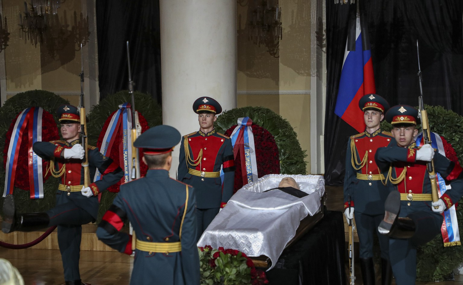 In dem Gebäude lag der Leichnam des ehemaligen Staats- und Parteichefs in einem grossen Raum mit Säulen im offenen Sarg – so war das schon bei früheren Sowjetführern nach deren Tod üblich.